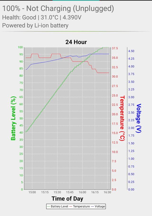 从40%到100%满电,金立M5仅用了不足两小时,整个充电过程中温度一直维持在40度以下,电压也相对稳定,可见金立M5的充电效率还是奇高。