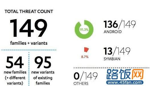 iOS 在这其中的数据为 0,显示出这个平台的安全性仍是消费者最可依赖的。F-Secure Labs 统计的移动平台还包括诺基亚的 Symbian、原 RIM 的 Blackberry、苹果的 iOS 以及微软的 Windows Mobile。