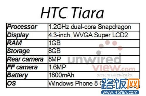 配置方面,曝光的信息显示,HTC Tiara将采用一块4.3英寸WVGA(480×800像素)级触控屏,搭载主频1.2GHz的高通骁龙双核处理器,并内置1GB RAM和一颗800万像素主摄像头(160万像素前置摄像头)。至于价格方面,鉴于该机的整体配置介于HTC 8S和HTC 8X之间,预计其售价也不会高过HTC 8X。