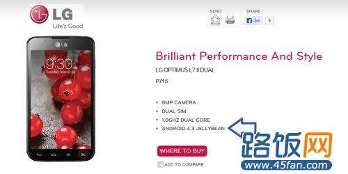 首款搭载安卓4.3系统的还有LG与谷歌携手推出Nexus 4,除了Nexus 4、HTC One、三星Galaxy S4这几款智能旗舰机外,在LG Optimus L7 II Dual手机的官方介绍中,也标示了预装安卓4.3系统的消息。