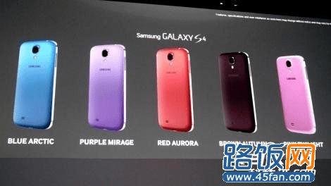 三星Galaxy S4新推出的五款颜色有:北极蓝(Blue Arctic)、梦幻紫(Purple Mirage)、极光红(Red Aurora)、深秋棕(Brown Autumn)和晚霞粉(Pink Twilight),看起来都是女性用户青睐的色系。此外,三星新推出的S4三防系列Galaxy S4 Active,也采用了灰色、橘色、蓝色三种颜色。