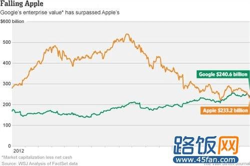 所以如果剔除掉这一部分资金的话,苹果的市值只有2330亿美元,谷歌则为2410亿美元。