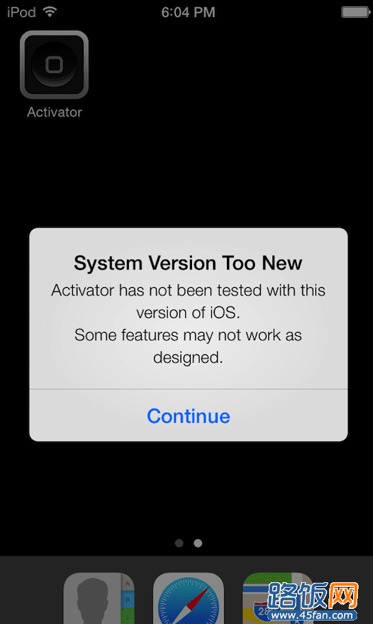 以上就是Petrich在推特上发布的屏幕截图。也有人推测Activator可能是安装在了某种模拟器而非真正的iOS上。但据我们所知,在模拟器的环境下并不会出现这种警告窗口。