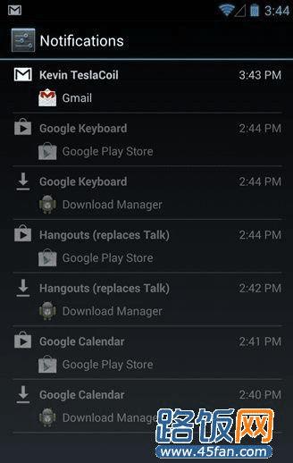 日前在Galaxy S4标准版和Google Play版上我们率先体验了Android 4.3系统版本,在界面上并未有太大的变化更多的后台和内部细节的调整优化。不过外媒今天发现了新系统中通知中心变得更加的强大,为那些第三方配件提供了 更加广阔的大门.未来有望通过深度整合为Google Glass或者智能手表等外设提供更加快捷的操作体验。