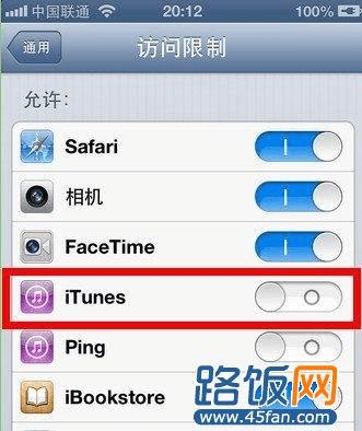 四、系统默认状态为关闭,若要打开访问限制,第一次需要输入二次密码。打开以后我们就可以关闭系统自带的应用软件了。比如我们不想使用系统自带的iTunes,就可以打iTunes右边的选项关闭,这样在手机的主屏上就不会出现iTunes了。关闭其它应用程序也是同样的操作方法。如下图所示: