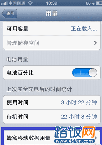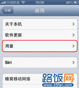 四、在“用量”列表中用手指向上滑动,找到“蜂窝移动数据用量”选项,点击打开,如下图所示: