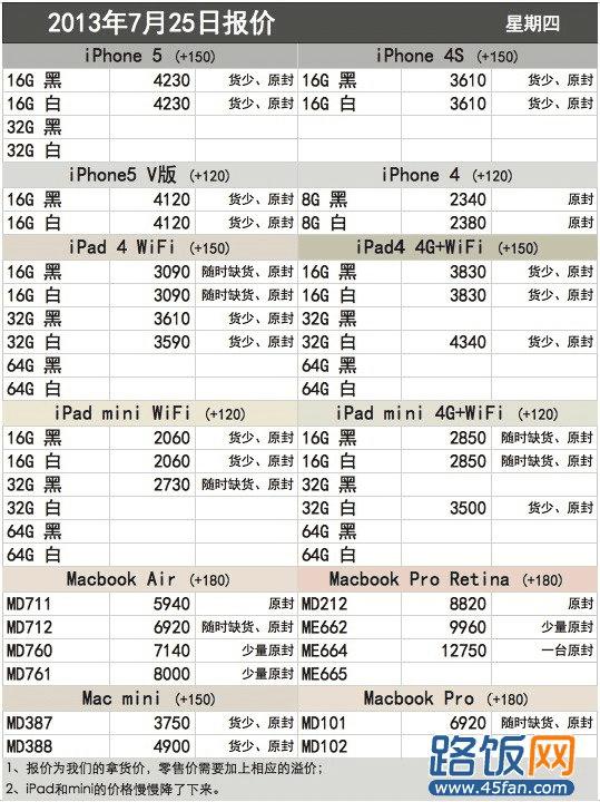 2013年7月25日iPhone4S/iPhone5/iPad报价已更新喽,详见如下图所示: