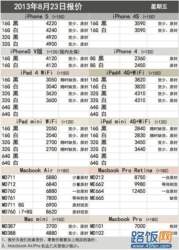 本周也到了总结一周iPhone系列产品报价的时候,从总体情况来看,iPhone5 16g白色、iPhone4S的价格上扬较大,其他系列产品价格几无变化。下面来看看今天8月23日苹果4,4S,苹果5,iPad(迷你)报价更新,详见下图所示: