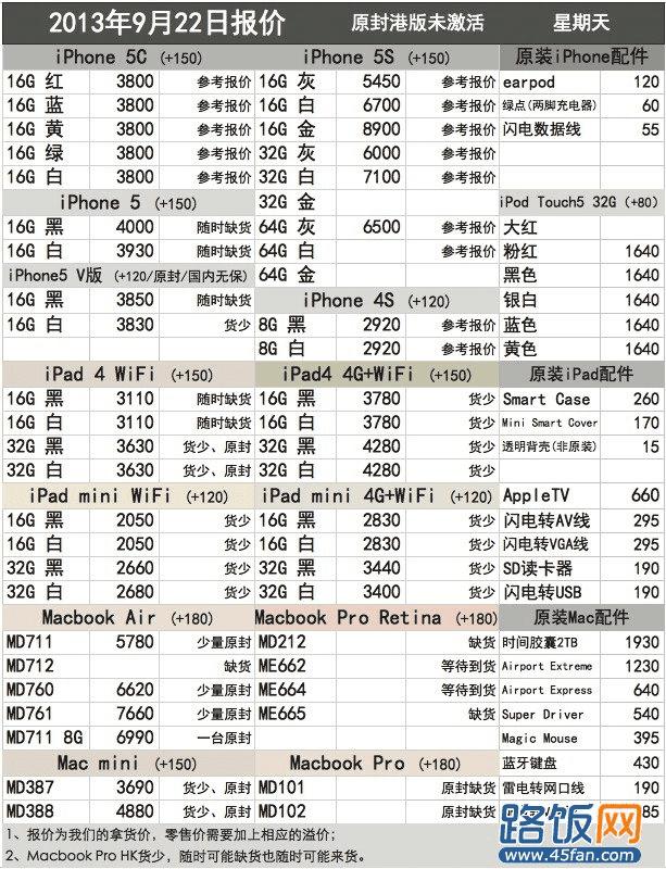 9月22日iPhone5C\5S\5、iPhone4、iPad报价更新
