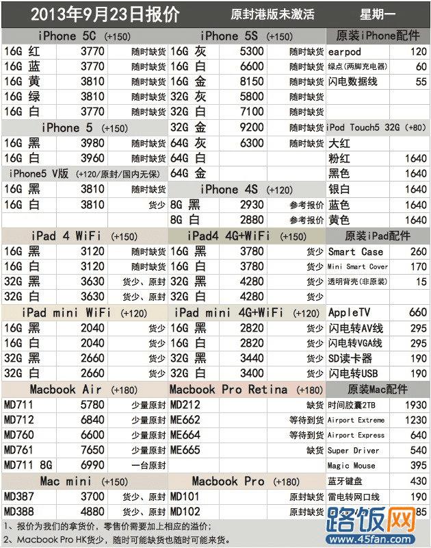 9月23日苹果各系列产品报价(iPhone4\4S\iPad,iPhone5C\5S暂时缺货)