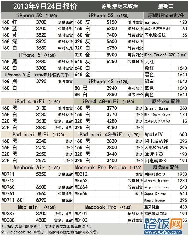 9月23日苹果各系列产品报价(iPhone4\4S\iPad,iPhone5C\5S暂时缺货)