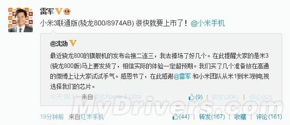 今天雷军在微博上第一时间@高通副总裁沈劲,并发消息称“小米3联通版(骁龙800/8974AB) 很快就要上市了!",沈劲在微博上感谢雷军和小米团队使用骁龙800版芯片并称体验效果将会超出预期。以下为微博截图: