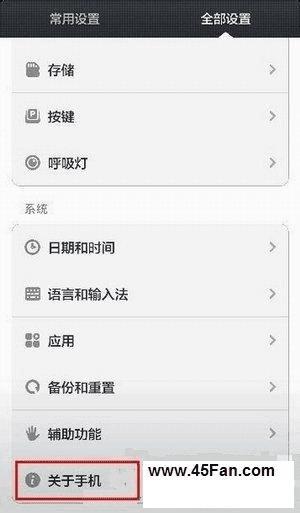 2、然后在设置列表下找到【关于手机】选项。如下图所示: