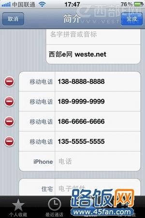 2、然后点击下方的【+添加电话】,右方输入电话号码,左侧是选择电话号码标签形式(住宅、工作、iPhone、移动等等),选中标签形式后,点右上角完成。如下图所示: