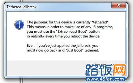 6、等越狱完成后,会弹出这个提示说这是不完美越狱需要引导开机。
