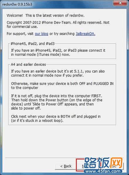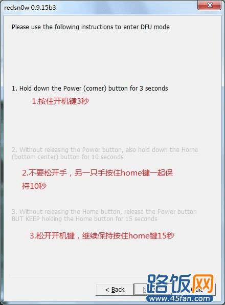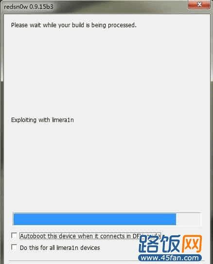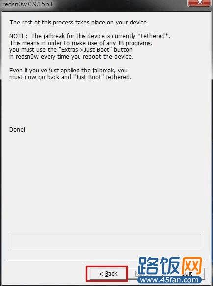 如果你正确进入到DFU模式后,红雪就会有反应开始引导开机了,此时你可以松开手等它慢慢引导开机就行了。