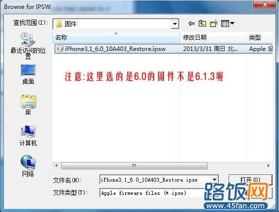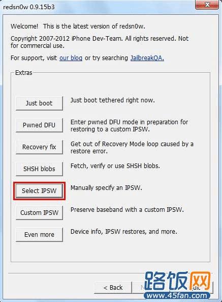 7、等手机越狱完正常进入桌面后。我们再进行引导开机。点击back返回再点击Extras--Select IPSW--选择对应本机iOS 6.0固件--(弹出你选择iOS6.0固件信息)点击确定--然后再点击Just boot