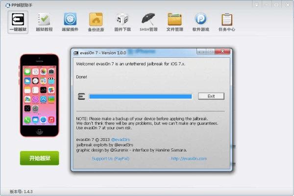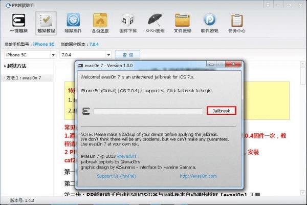 3、PP越狱助手自动识别iOS设备与固件版本自动弹出越狱【evasi0n 7】工具;