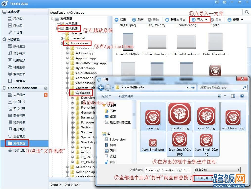 安装好iTools并打开然后接上你的手机。等待片刻后iTools即可识别你的手机了,然后进入到/Applications/Cydia.app/这个路径,也就是依次点击左侧的“文件系统”>>再点“越狱系统”(如果看不到越狱系统请到Cydia搜索安装afc2add这个插件)>>然后再点“Applications”>>再进入“Cydia.app”>>点击“导入”--“文件”>>在弹出的选择框中找到要替换的图标然后全部全中再点击“打开” 这样就替换好图标了。如下图: