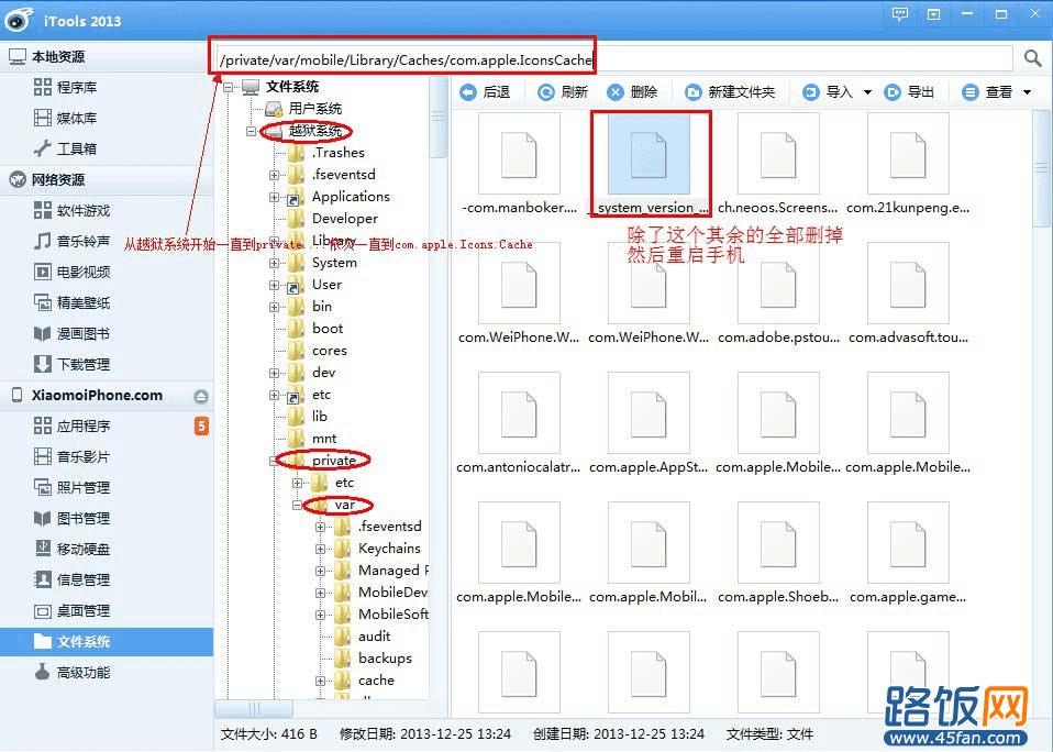 替换图标后还是不能马上生效的,需要清除图标缓存。在iTools上依次进入到这个路径/private/var/mobile/Library/Caches/com.apple.IconsCache 删除__system_version_info__ 以外的其他文件,这些缓存文件不会影响到系统的不会出问题的,放心删吧。如果你只是想替换图标的话,完成这一步重启手机就可以了。如果想修复Cydia图标错位问题继续下一步。