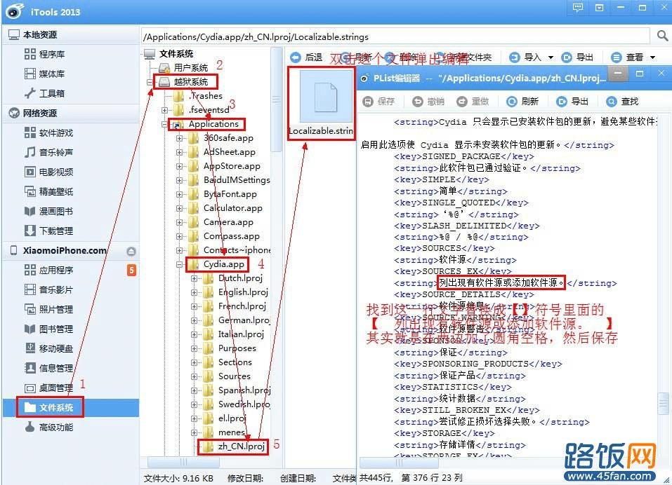 在iTools上进入到这个路径/Applications/Cydia.app/zh_CN.lproj/然后找到Localizable.strings这个文件双击弹出编辑找到【列出现有软件源或添加软件源。】这句话改成【 列出现有软件源或添加软件源。 】复制【】符号里面的包括两边的空格。其实就是在两边加上空格让它换行这样就解决了错位问题。修改完后点击左上角的“保存”然后重启手机就完成了。