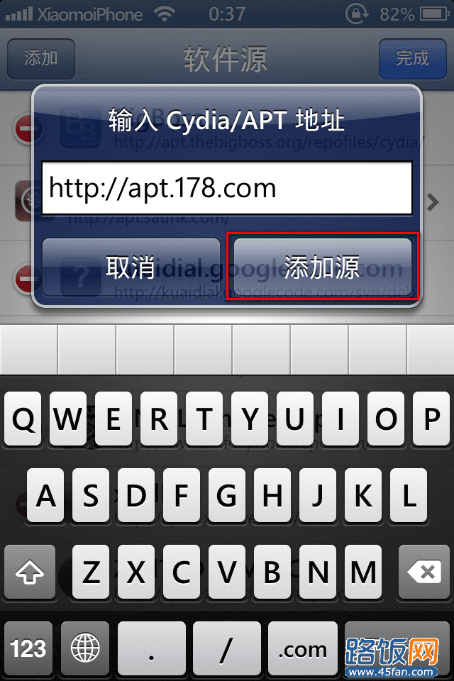 5、在弹出的Cydia/APT地址框里输入软件源地址。咱们这里地址以http://apt.178.com为例。确认输入无误后,点击"添加源“按钮。如下图所示: