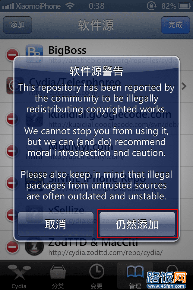 编后语:以上就是关于Cydia如何安装软件 Cydia软件源添加图文教程,其实挺简单的,总结起来就打开【Cydia】-【管理】-【编辑】-【添加】-【输入源地址】-【添加源】,然后按照提示操作即可。