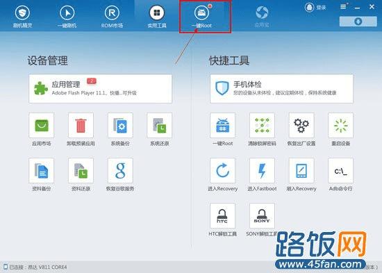 第二步:刷机精灵的菜单栏有一个【一键root】工具,单击即可。