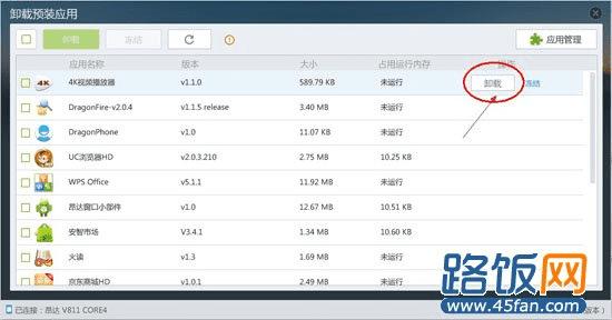 第三步:点击【卸载预装应用】按钮,此时手机上面所有的应用都会显示出来,把光标移动要卸载的应用上面,旁边就会出现【卸载】按钮,点击卸载即可。