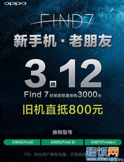 昨日,《OPPO Find 7好事成双 双版齐发布》刚刚出台,今日路饭网又得知消息:OPPO Find 7轻装版换购将于12日开启,选用主题为“新手机·老朋友”。