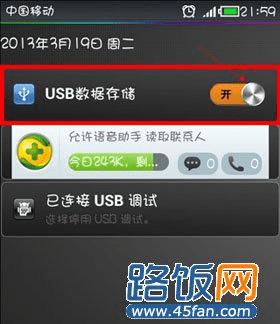 手机连接电脑之后,拉下通知栏,就可以看到【USB数据存储】,点击关闭即可。如下图所示: