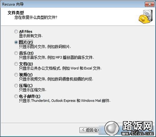 启动Recuva,首先选择恢复的文件类型,我们恢复照片,就选择图片。