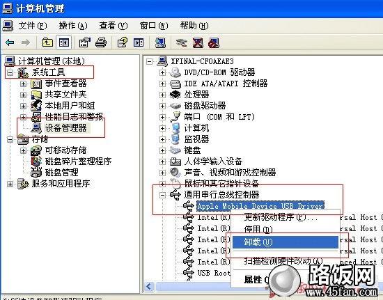首先,保证自己的电脑上已经安装有iTunes,将iPhone用USB数据线连击电脑。然后,右键点击【我的电脑】,选择【管理】-【计算机管理】,在左侧栏中选择【系统工具】-【设备管理器】,然后在右侧栏中,选择【通用串行总线控制器】-【Apple Mobile Device USB Driver】,然后右键点击,选择【卸载】。