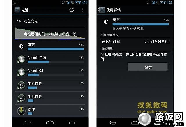 日常使用强度下,Nexus 4平均可续航22小时左右。其中屏幕点亮时间在2小时——2.5小时。