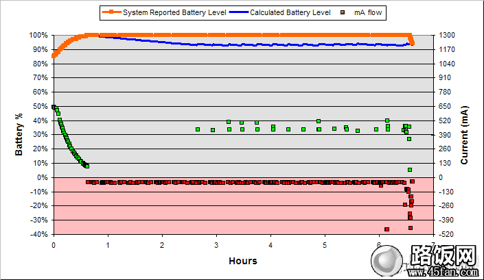 根据系统记录,当手机从充电器上拔下约6.5个小时之后,电池电量开始急剧下降。而从此图中可以看出,到手机使用6.5小时的时候,电流的确升高了,这并不能解释系统记录中3分钟内消耗了6%的电量。维持100%满电的状态很明显是不可能的,这是因为有很长一段时间,手机系统只能靠电池供电。