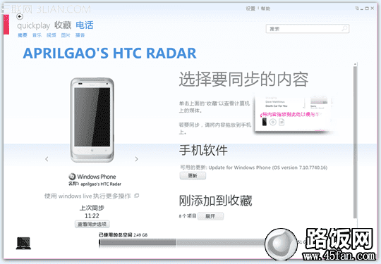 第二步:打开电脑上的zune,放手机处于同步状态;