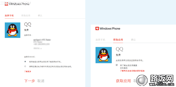 第二步: 按提示选择手机或输入手机号码,若想自动安装到手机上请选择“使用短信立即将此应用下载到我的手机”,并且确定手机已经开启相应接受功能(设置->查找我的手机->更快地连接这些功能),然后点击[下一步];
