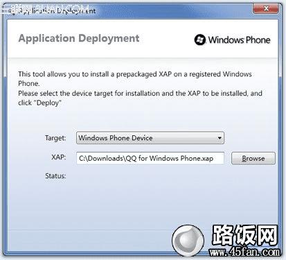 第三步:打开开始->程序->Windows Phone SDK7.1 -> Application Deployment(应用部署),在Target(目标)中选择[Windows Phone Device](手机设备),通过[Browse](浏览)按键选择您下载到电脑上后缀为.xap的QQ安装包;