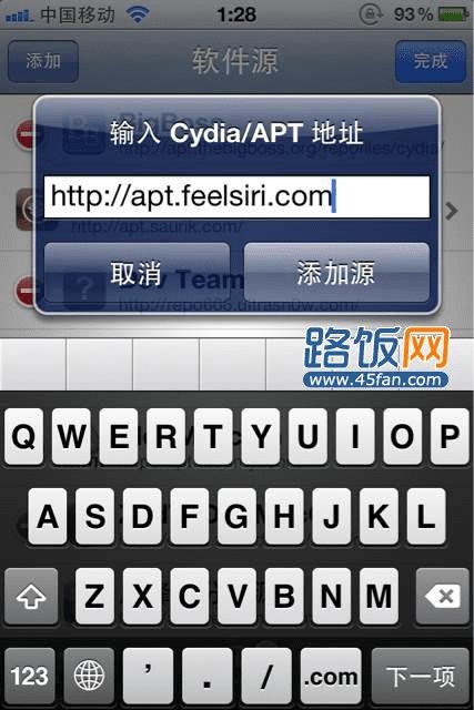 2、在添加源中要求输入Cydia/APT地址,输入“http://apt.feelsiri.com“,大小写无所谓。