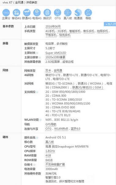 网络方面vivox7为双卡双待全网通4G+。其他方面指纹识别当然不能少,而且是vivo首次采用正面指纹,熄屏解锁只需0.2秒,亮屏解锁0.15秒,新增ID wake(双击指纹进入微信等应用)、微信熄屏支付。vivo的一贯特色Hi-Fi自然也是重点环节,这次采用了AKM4376方案,内容合作QQ音乐,享受绿钻正版无损音源。
