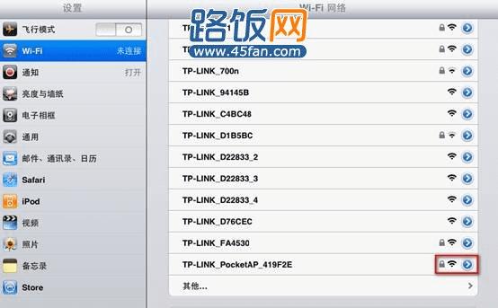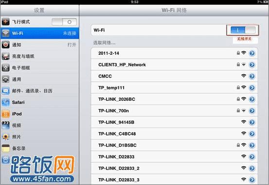 1、将iPad无线开关打开。步骤:设置---Wi-Fi,如下图所示: