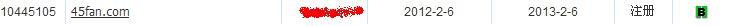 笔者用鼠标指向"B”此图标后,出现说明字样“购买方式为正式购买,运行状态为续费处理中”,没办法,因为实在太晚了,此时也无法联系客服。于是只能等。今天上午10点的时候,笔者询问了美橙互联客服,答复是续费已成功。客服告诉我说之前用手机打开www.45fan.com网站时出现114导航站的情况,确如笔者所料,该域名被锁定了。如果不及时续费,则很有可能会被别人抢注。