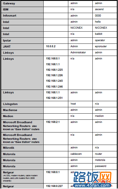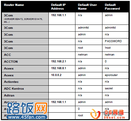 很多人在买回路由器后,都在网上问或是找朋友问,路由器的默认用户名和密码是多少?今天笔者将用几幅简图列举绝大多数路由器(包括国内主流路由器)默认用户名和密码,图中Default Password中标注的n/a表示密码为空,另外需要注意某些路由器密码的大小写问题。