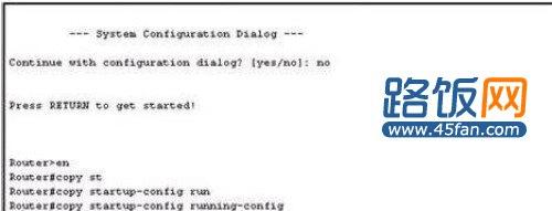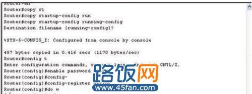4、重启之后路由器已经跳过了startup-config配置文件,然后保存startup-config文件到running-config即当前配置。命令是:Router#copy startup-config running-config