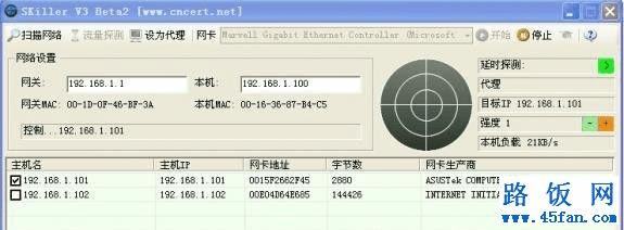 可以看到,目前在我的局域网内有2台主机(自己的不显示),你想要控制哪一台的网速就要在那台主机的前面打上钩,再点击开始,你就对这台主机实施控制了,这是,你可以点击右边的强度上面的+和- 来调节控制的强度,数值越高表明他的网速越慢,呵呵偷笑吧,最为阴险的是,你可以点击下设为代理,这样,你去限制别的机器网速的时候,