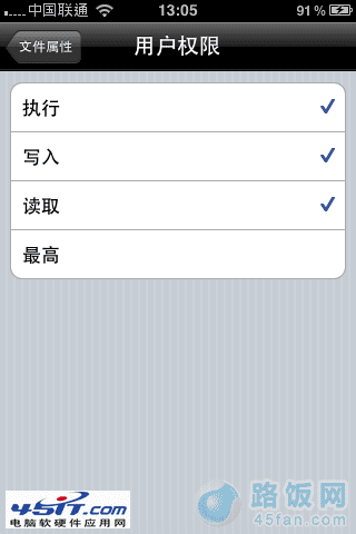 用91或者WINSCP修改权限的时候,权限是用一组3个数字来表示的,而iFile是更为直观的方式