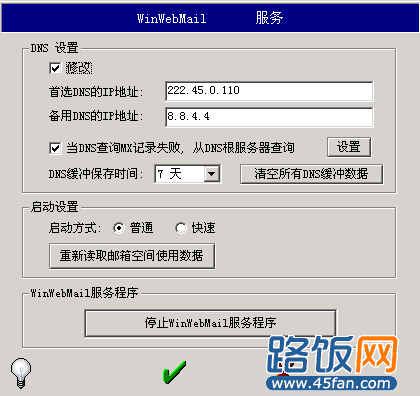 设置完成后,单击下边的勾选即可。注意:在修改DNS前,最好先停止Winwebmail服务程序,待修改完成后,再启动。