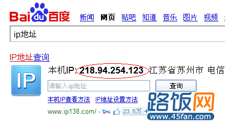 方法一:打开ie浏览器,在地址栏中输入www.baidu.com,回车。进入百度搜索界面,然后在搜索框中输入"IP地址“,此时你所使用的公网IP地址就展现出来了,如下图所示: