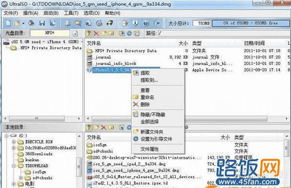 UltraISO安装完成后,运行,将dmg格式拖动到如上图所示框中,双击DMG格式,会出现如下图所示:(内含ipsw格式的固件,右键提取保存就ok了)
