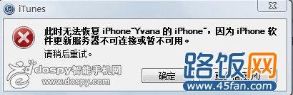 6、如果恢复时候出现:此时无法恢复iPhone ,因为iPhone软件更新服务器不可连接或暂不可用(我就出现了……)